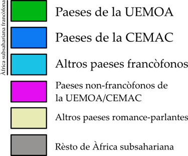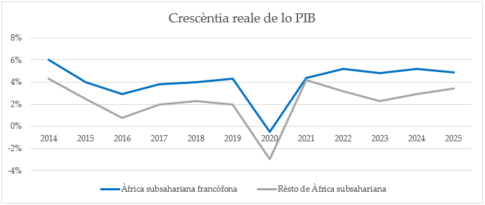 Secondo la plus recènte anàlise de lo CERMF (Centre d'Etude et de Réflexion sur le Monde Francophone), basato sopre los datos semestrales de perspectivas econòmicas de la Banca Mondiale et las últimas estimationes de lo Fondo Monetario Internationale (FMI), cuesto gruppo de 22 paeses ha registrato un taxo de crescèntia globale de 4.9%, frònte ad lo 3.4% de lo rèsto de la Àfrica subsahariana. En lo mesmo tèmpo, la inflatione mèdia èst remanuta entorno ad 4 %, bène sobto lo 17.4% observato en los altros paeses, mentre lo débito público se situau entorno ad 51.6% de lo Producto Interiore Brutto (PIB), trédece pontos percentuales plus basso que lo rèsto de la regione.