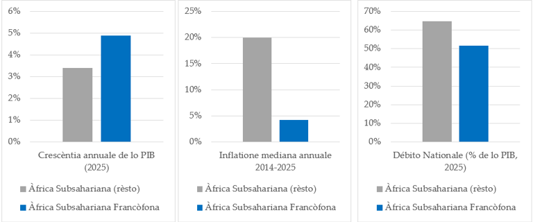 En lo período 2014-2025, lo CERMF calcula que la inflatione mèdia annuale en la zòna francòfona se situau entorno ad 4.2%, frònte ad quasi 20% en lo rèsto de Àfrica subsahariana, cuò que illustra la consistèntia de cueste avvantagge plus oltra un solo anno.